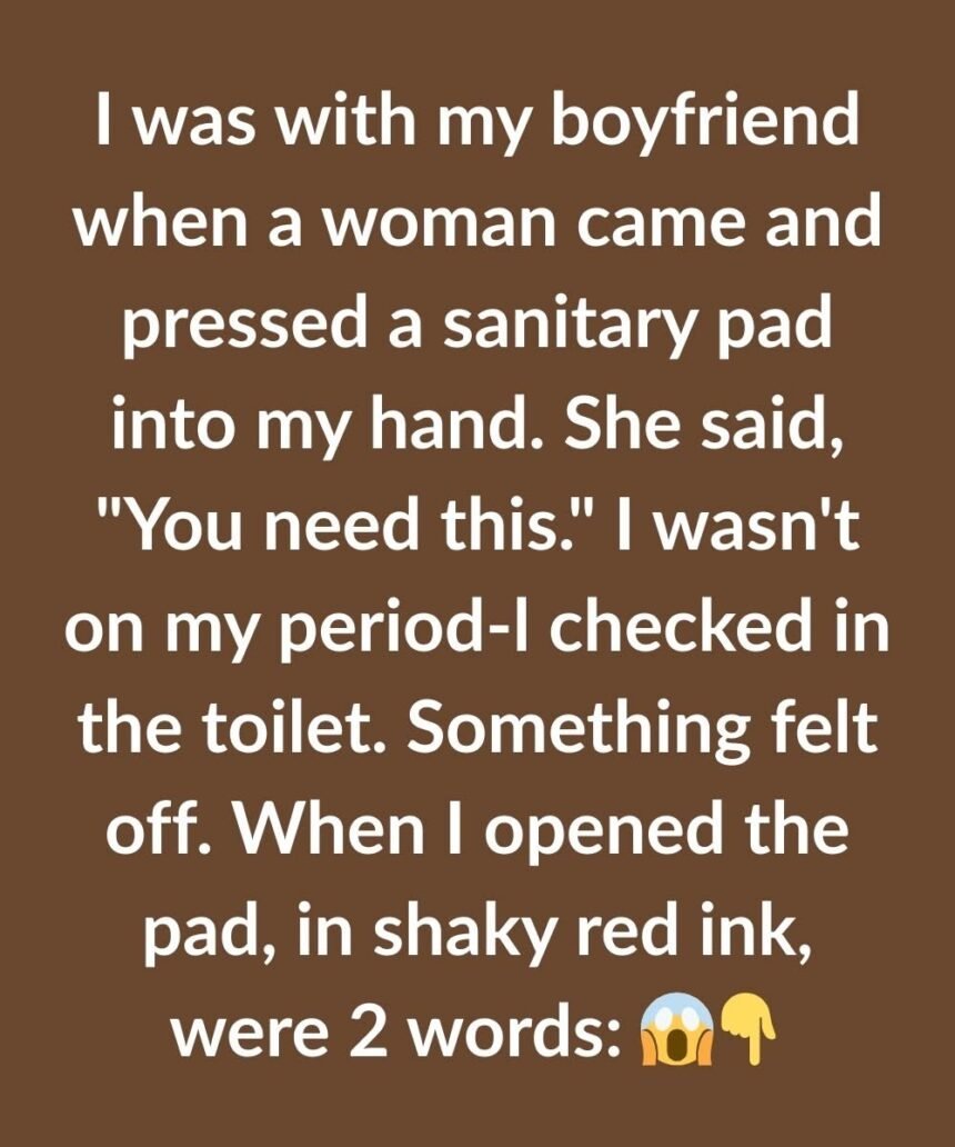 I was with my boyfriend when a woman came and pressed a sanitary pad into my hand. She said, “You need this.” I wasn’t on my period—I checked in the toilet. Something felt off. When I opened the pad, in shaky red ink and frantic writing, were two words: “Google him.”