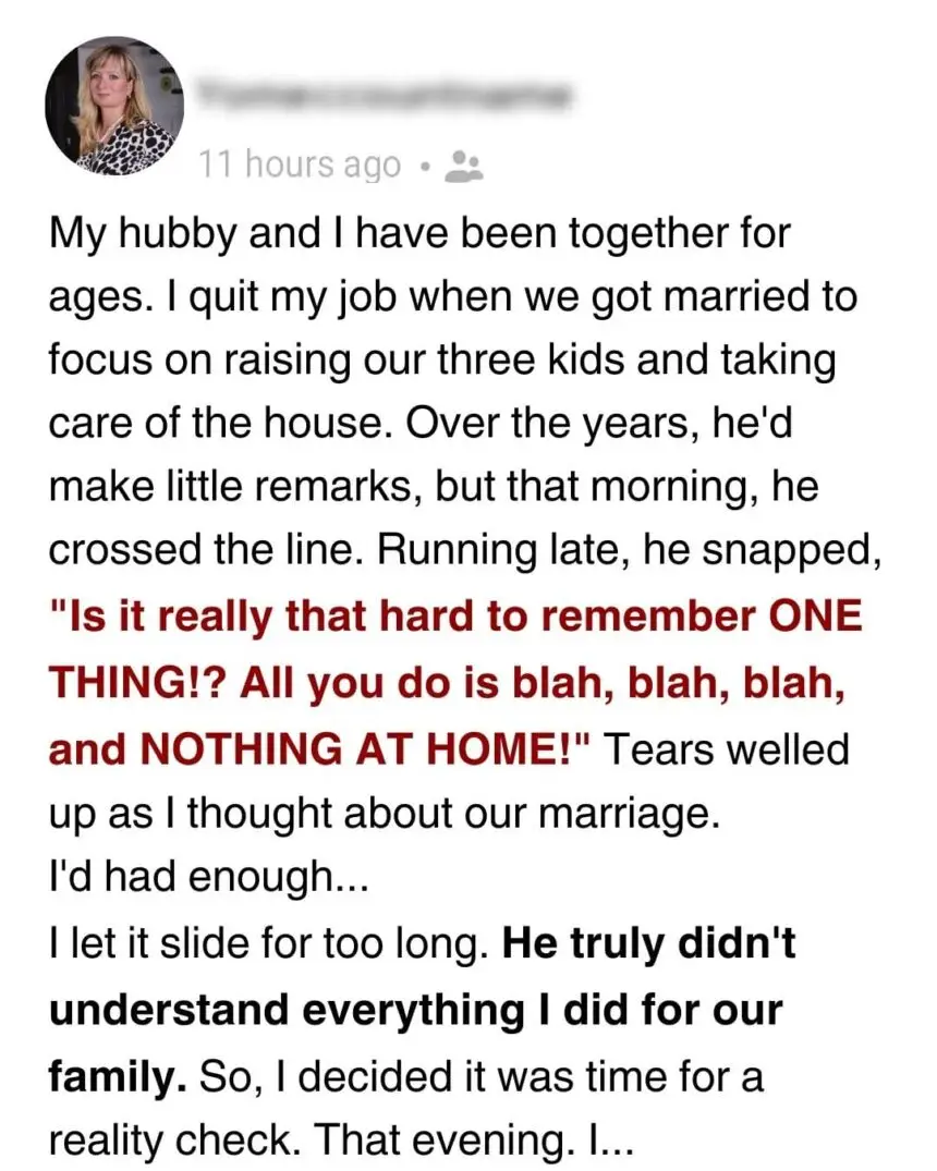 After all, he worked long hours to support us. But lately, it got worse and more personal. The remarks stung.