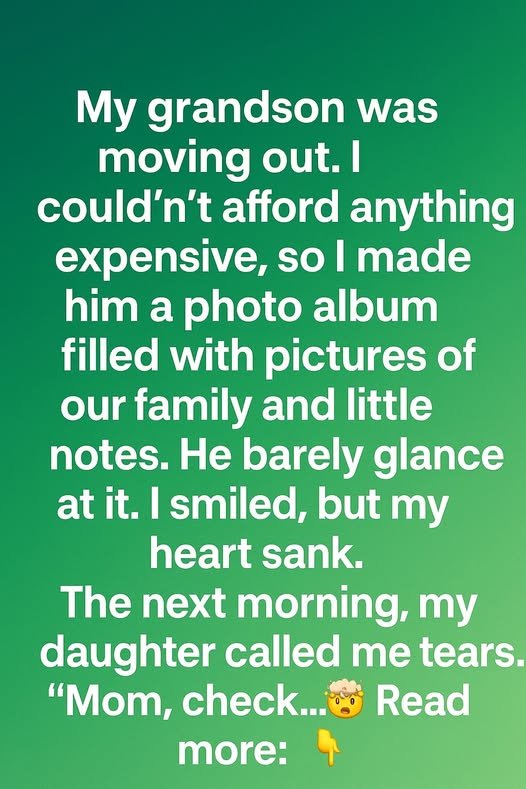 My grandson was moving out, and though I wished I could give him something grand, my budget was tight. Instead, I created a heartfelt photo album filled with family pictures and handwritten notes capturing moments we cherished. When I handed it to him, he barely glanced at it before returning to packing.