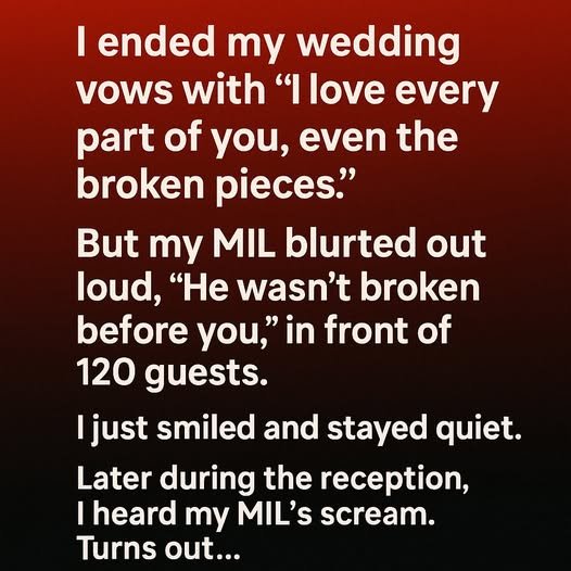 I ended my wedding vows with, “I love every part of you, even the pieces shaped by life.” Before the guests could applaud, my mother-in-law suddenly blurted, “He wasn’t struggling before you,” turning the joyful moment into an awkward silence. I chose to keep smiling, reminding myself that her words reflected her worry, not the truth. My husband gave me a reassuring glance, grounding me in the love we had just promised each other.