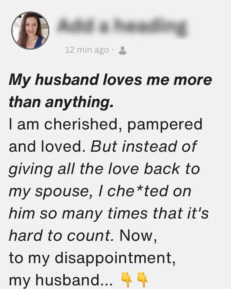 The woman goes on with her confession, saying, «It took me a serious threat of divorce and a temporary separation to understand just how much I was about to lose. Since then, I have done everything I can: I came clean, we’ve had conversations about my affairs, recently I also did a written disclosure with the help of our marriage counselor.