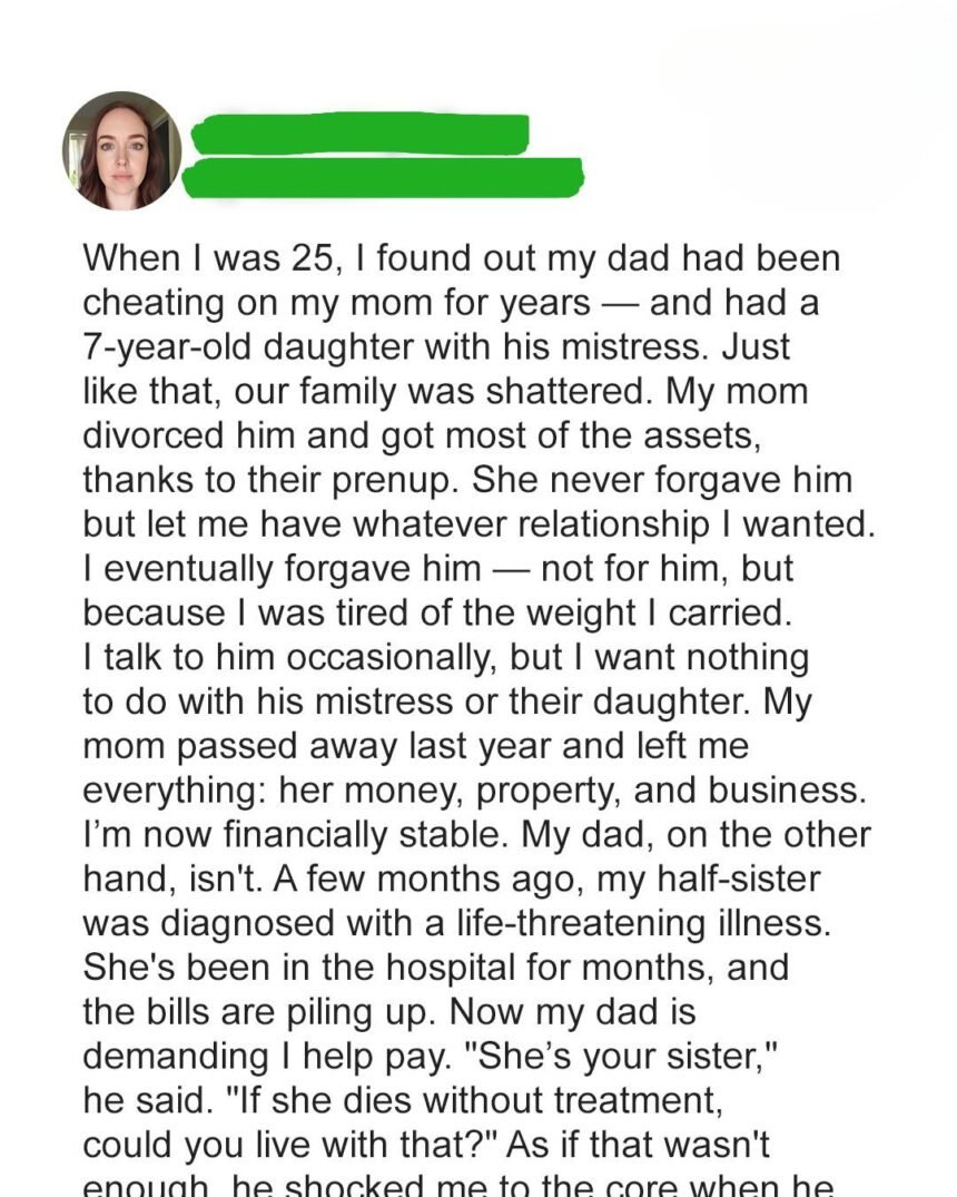 Though I felt compassion for the child, I couldn’t ignore that my mother’s money symbolized her sacrifice, her strength, and her independence after betrayal. Using it that way felt like erasing her story. When I refused, my father’s words turned sharp.