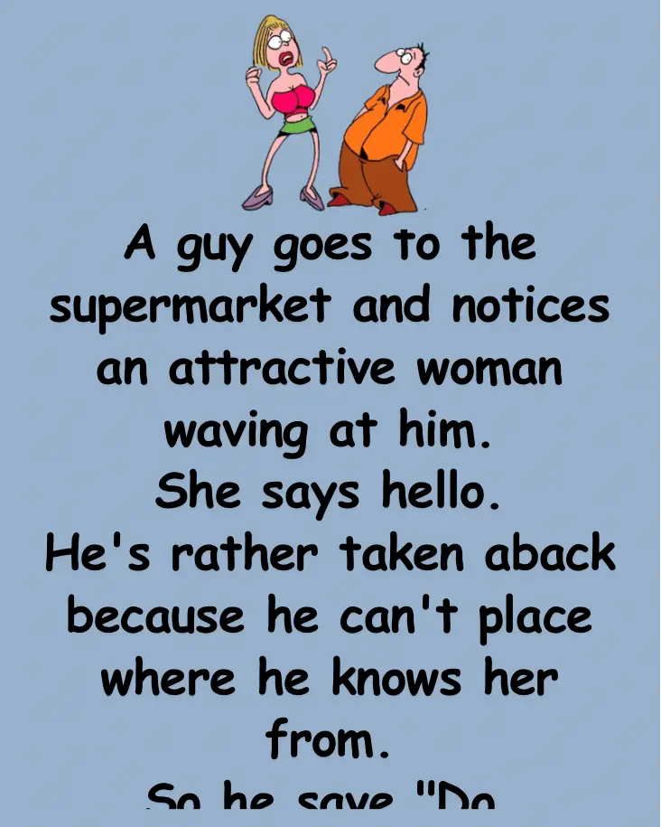 A guy goes to the supermarket and notices an attractive woman waving at him.She says hello.