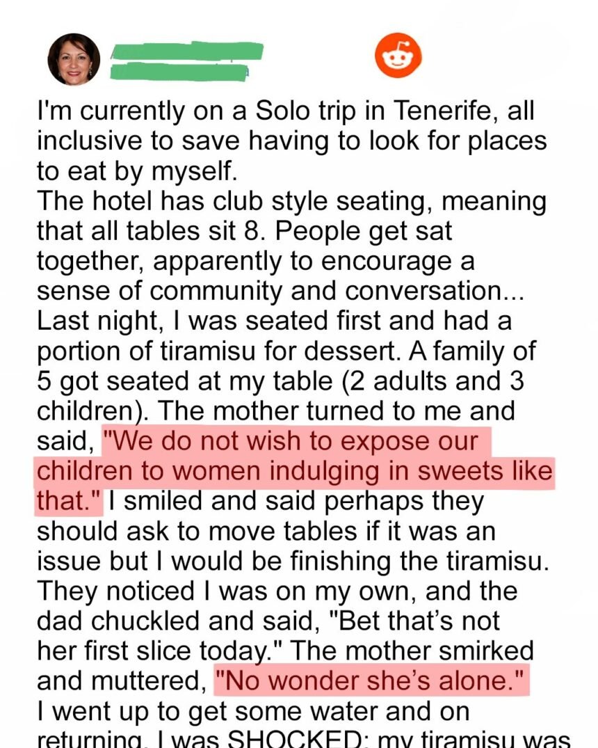 The meal was perfect—grilled fish, roasted vegetables, and then came the star: a delicate tiramisu with a dusting of cocoa. But before I could enjoy more than a bite, a family of five joined my table. The mother, Sarah, took one look at my dessert and frowned.
