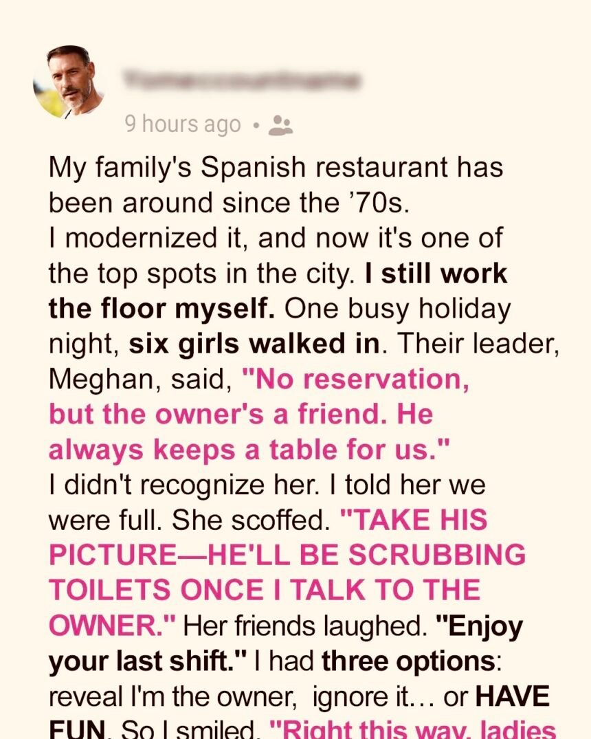 I’ve seen my share of entitled customers over the past 15 years in the restaurant business. But nothing prepared me for the night Meghan waltzed in, throwing around a friendship with “the owner” to demand special treatment. If only she knew who was really taking her drink order.