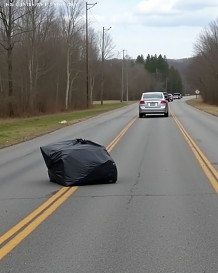As he drew closer, he noticed the rear door of the car crack open, and in a flash, something was tossed onto the roadside. The door slammed shut, and the vehicle sped off into the misty rain.