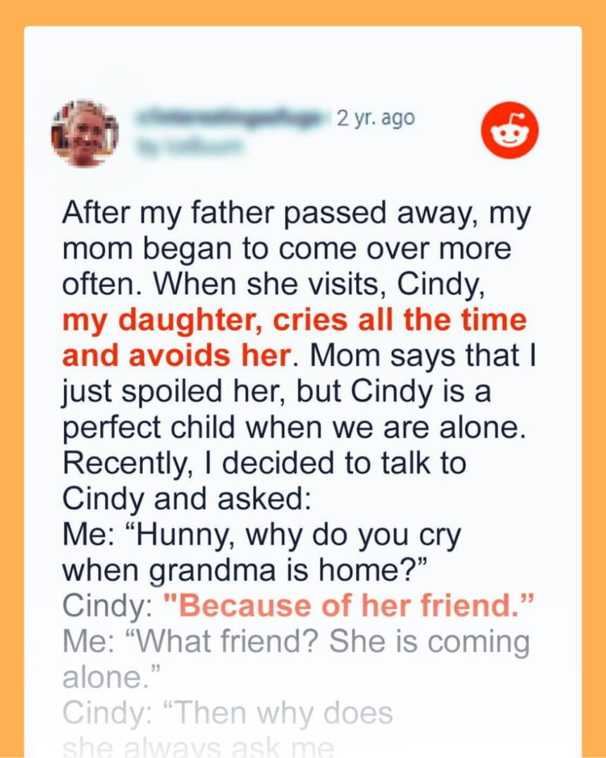 They came over every third week, and Mom brought food.But when my father passed away, everything changed. I have my own family now — a husband and a six-year-old daughter named Cindy.