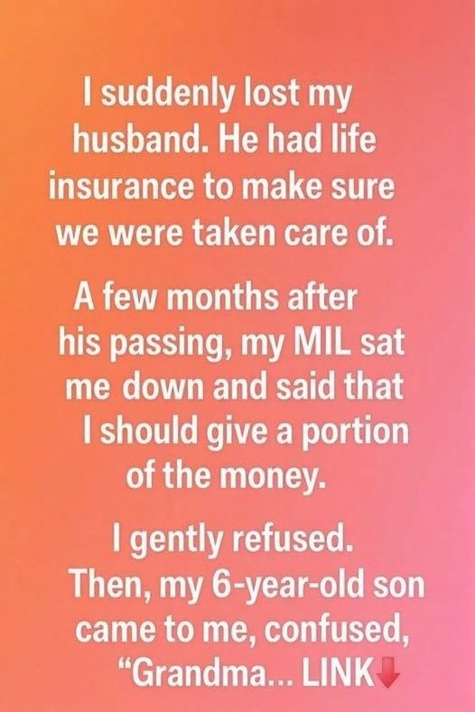 I suddenly lost my husband. He had life insurance to make sure we were taken care of. A few months after his passing, my MIL sat me down and said that I should give a portion of the money.