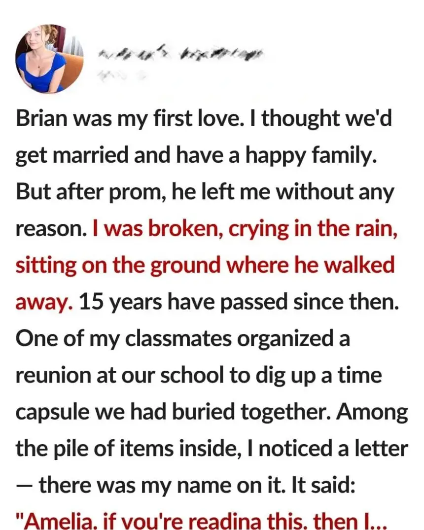 Fifteen years after graduating, I returned to my hometown to open our high school time capsule. What seemed like a nostalgic reunion quickly turned into something deeper. As we unearthed old memories, I discovered the shocking truth about the betrayal and heartbreak that shaped my life all those years ago.