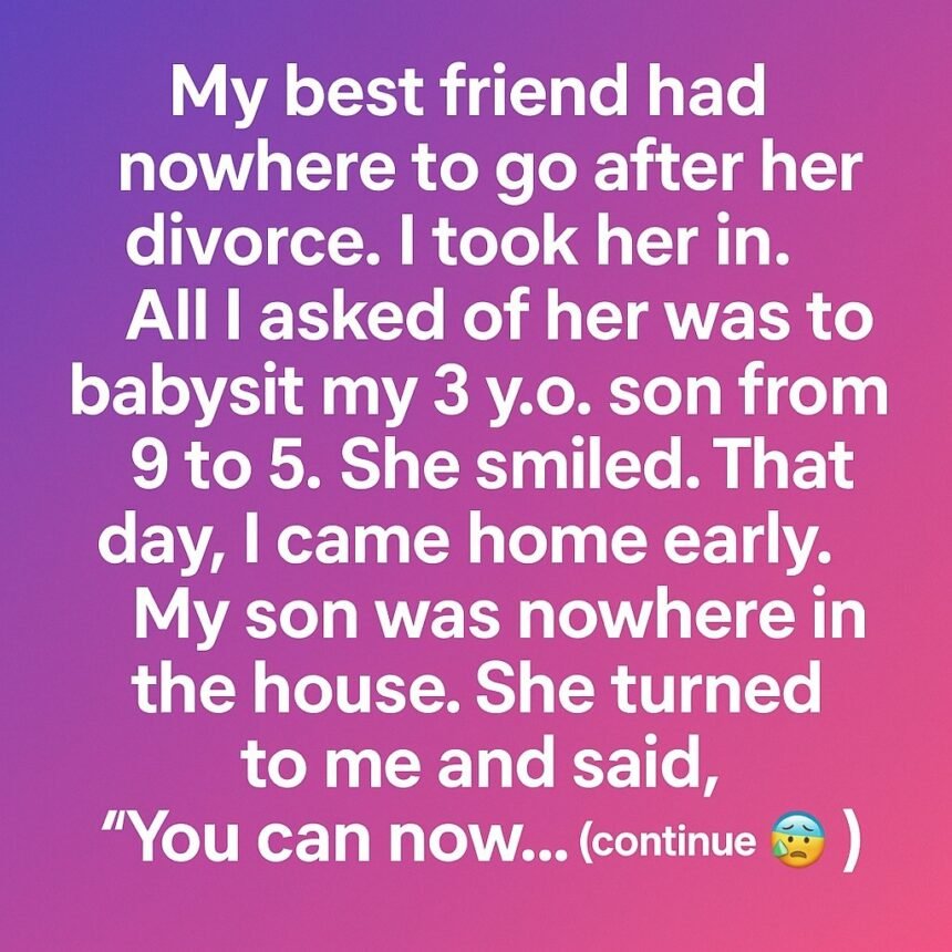 My best friend had nowhere to go after her divorce, so I took her in. All I asked was for her to babysit my 3-year-old son while I worked from 9 to 5. She agreed with a smile.