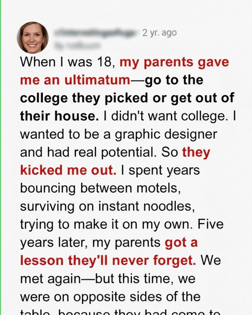 Five years later, my receptionist told me there was a walk-in couple looking for design help. When I stepped into the room, I froze — it was my parents. They looked older, quieter, and surprised to see me behind my own office desk.