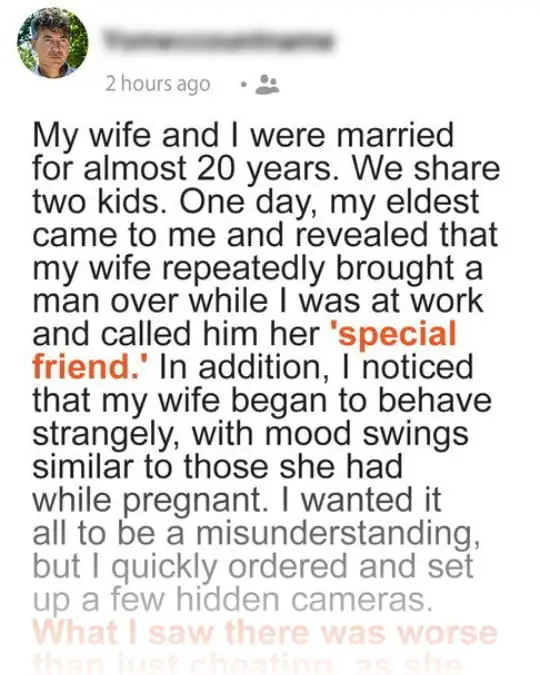 The mother referred to the man as her “special friend” and kept the kids silent with a few bribes. The OP then noticed a few unusual things about his wife’s behavior.
