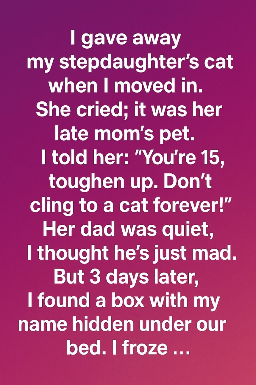 Don’t cling to a cat forever!” Her dad was quiet, I thought he’s just mad. But 3 days later, I found a box with my name hidden under our bed. I froze …Inside that box wasn’t anger, revenge, or anything cruel.