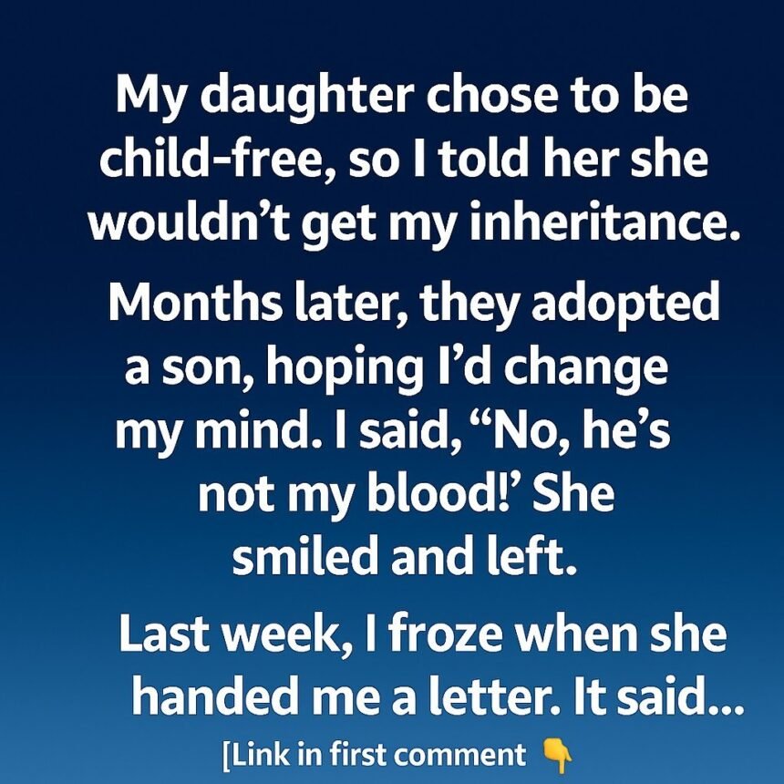 Last week, Claire came to visit. She handed me a sealed letter, her hands trembling slightly. Inside, I read words that pierced my heart: “Family is not about blood, it’s about love.