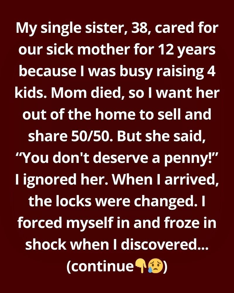 My single sister, 38, cared for our sick mother for 12 years because I was busy raising 4 kids. Mom died, so I want her out of the home to sell and share 50/50. But she said, “You don’t deserve a penny!