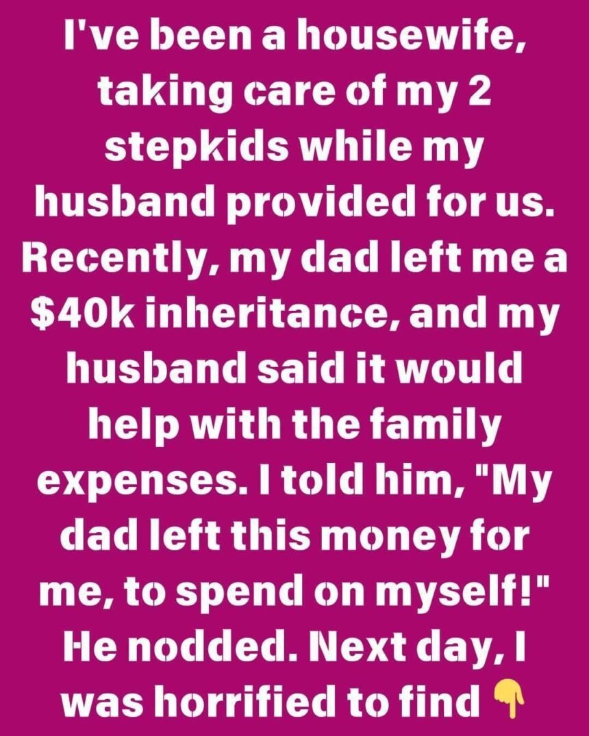Recently, my dad left me a $40k inheritance, and my husband said it would help with the family expenses. I told him, “My dad left this money for me, to spend on myself!”