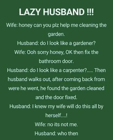 Then husband walks out, after coming back from were he went, he found the garden cleaned and the door fixed.