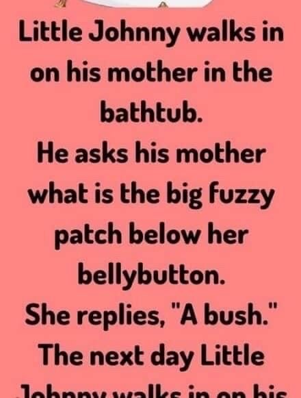 .He asks his mother what is the big fuzzy patch below her bellybutton. She replies, “A bush. The next day Little Johnny walks in on his father while he’s in the shower.