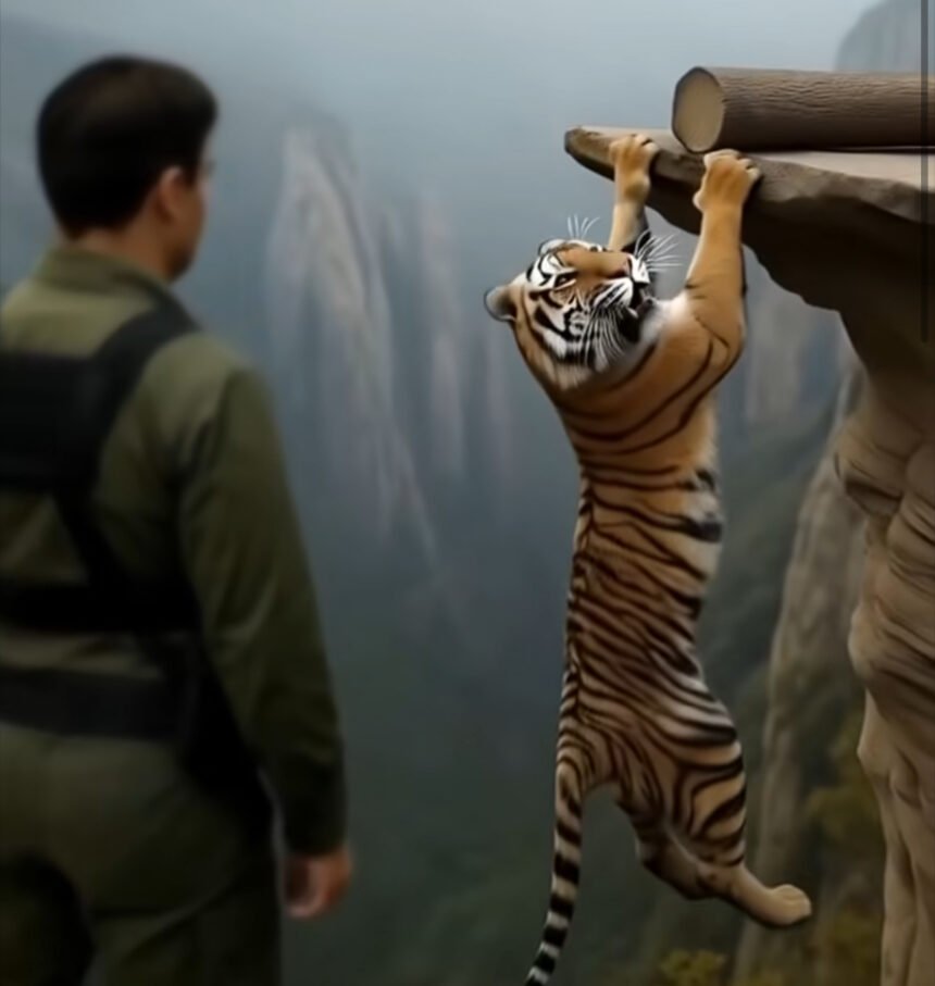 He turned slowly, scanning the treeline, expecting a wild boar, maybe even a leopard. But what he saw made his breath catch in his throat. There, just meters away, dangling on the edge of a broken slope, was a full-grown tigress.