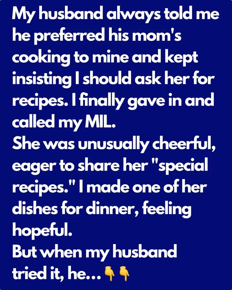 I finally gave in and called my MIL. She was unusually cheerful, eager to share her “special recipes.” I made one of her dishes for dinner, feeling hopeful. But when my husband tried it, he spit it out and said it tasted horrible.