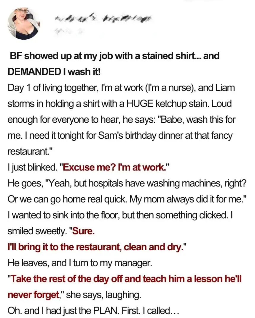 When Katie’s boyfriend, Liam, burst into her workplace clutching a ketchup-stained shirt and demanding she wash it, she thought she’d seen it all. But what started as an audacious request turned into a perfectly planned lesson in responsibility.