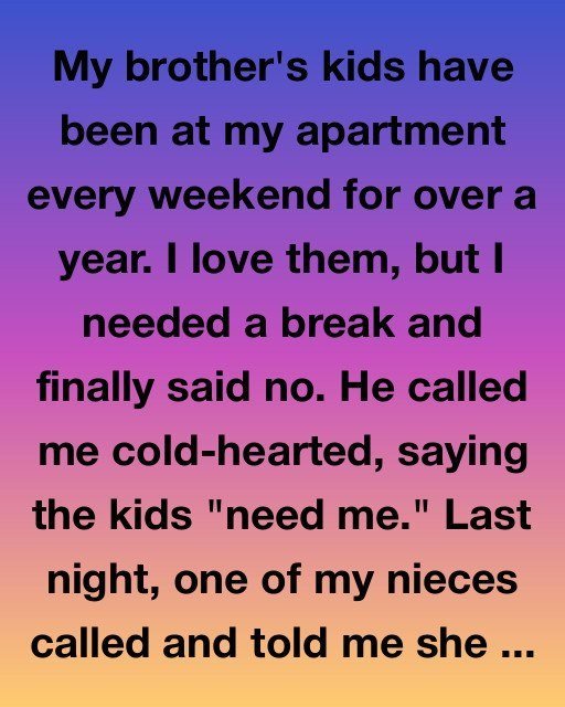 My brother’s kids have been at my apartment every weekend for over a year. I love them, but I needed a break and finally said no. He called me cold-hearted, saying the kids “need me.” Last night, one of my nieces called and told me she didn’t want to go home.