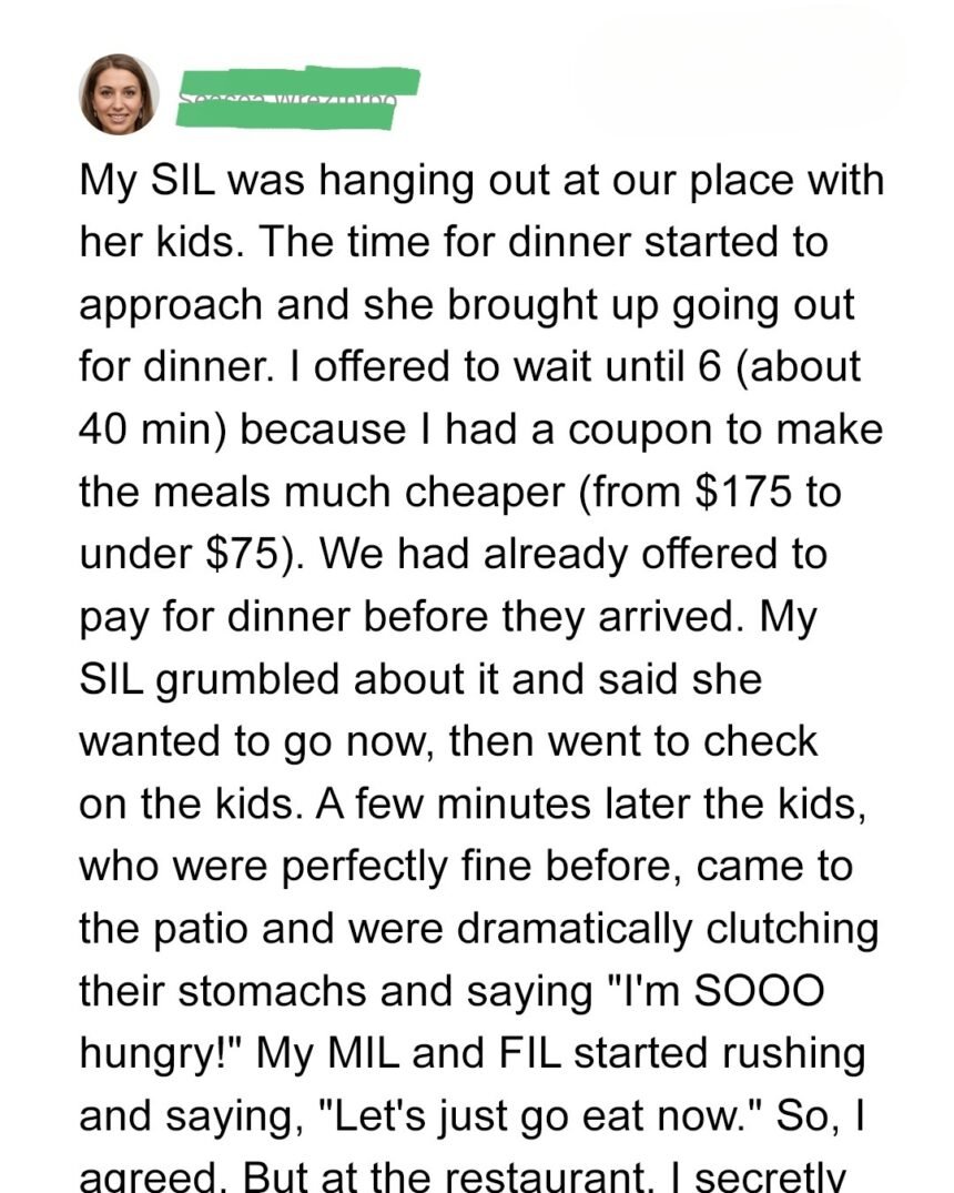 I offered to treat the whole family to dinner. My sister-in-law refused to wait 45 minutes, whining that her kids were “so hungry.” She dragged us out early… and I agreed, with a little plan up my sleeve that served her a full plate of reality and regret. The afternoon sun streamed through our kitchen window as I watched my eight-year-old nephew, Jake, carefully outline a rainbow with blue chalk on our patio.