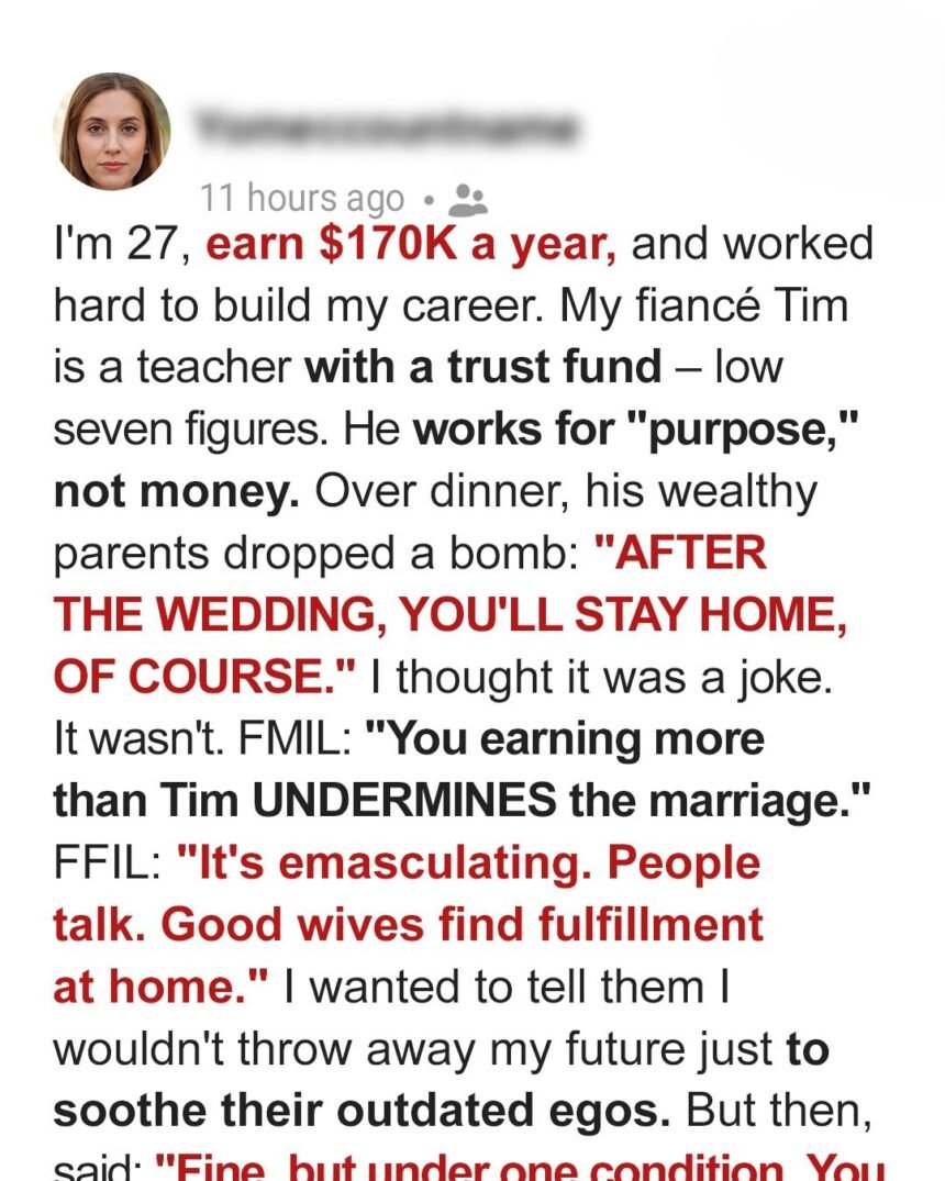 He comes from old money, and last week, his parents tried to buy my compliance with a dinner invitation. Between monogrammed napkins and $30K rugs, they asked me to quit my job after marriage to preserve Tim’s “manliness.”