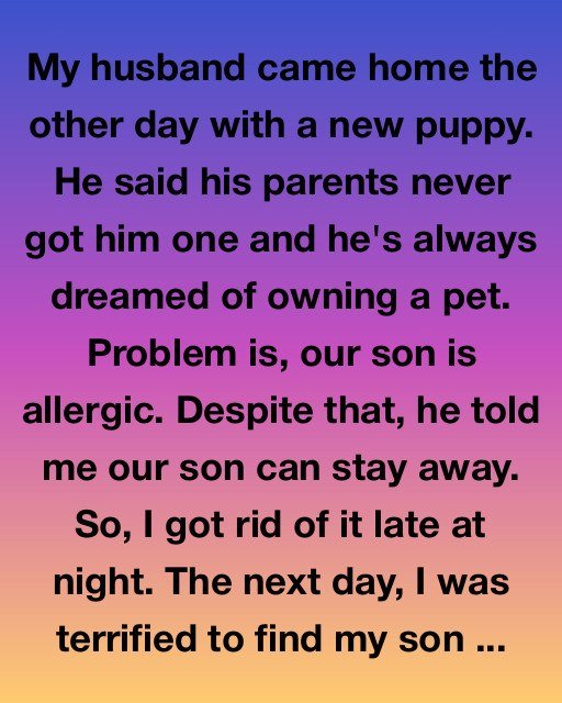But I couldn’t justify it anymore—not when our son was suffering. The next morning, I packed a bag for our boy and took him to my sister’s. I told her everything—about the puppy, the hospital, the way my husband had reacted.