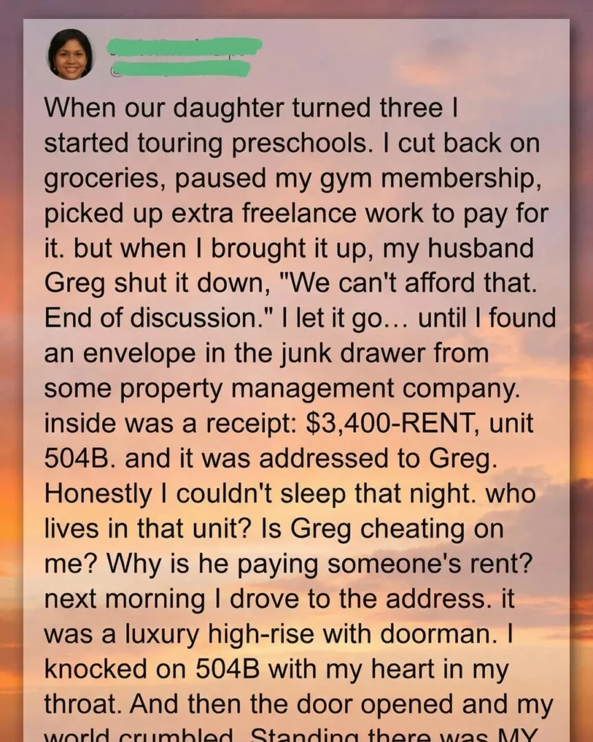 One Saturday during spring cleaning, I discovered an envelope tucked into our junk drawer—a neatly folded receipt from a luxury apartment building downtown. It showed a monthly payment of $3,400 for a unit I had never heard Greg mention. Confused and unsettled, I followed my instincts and visited the building myself.