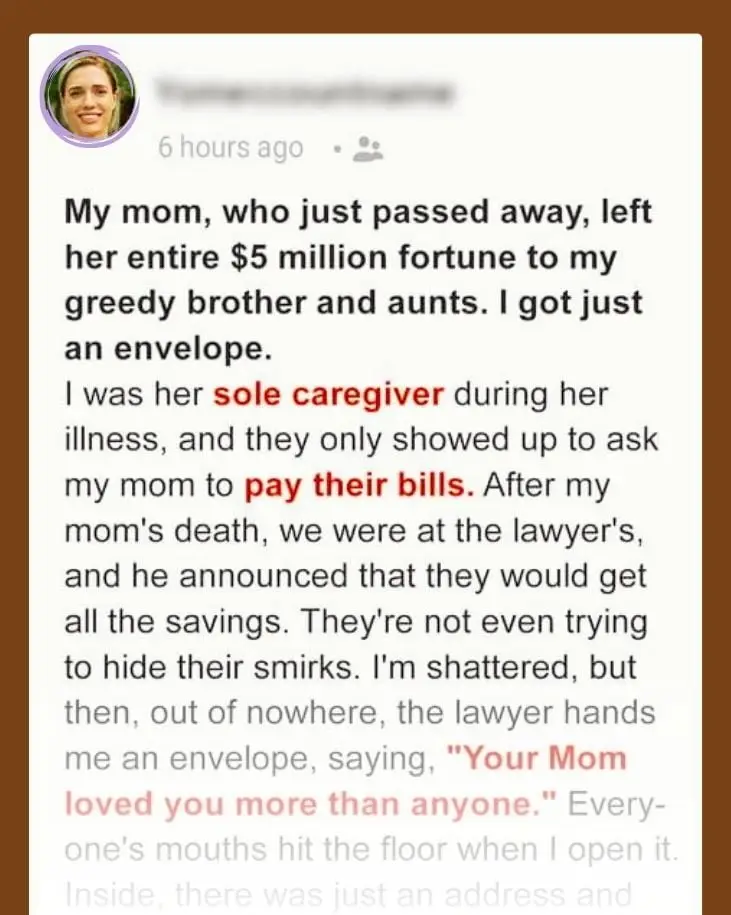 While my mom battled cancer, I was her caregiver, nursing her until her final days. But when she passed away, my mom split her money between my money-hungry brother and aunts. But it turns out that there was more to the story.