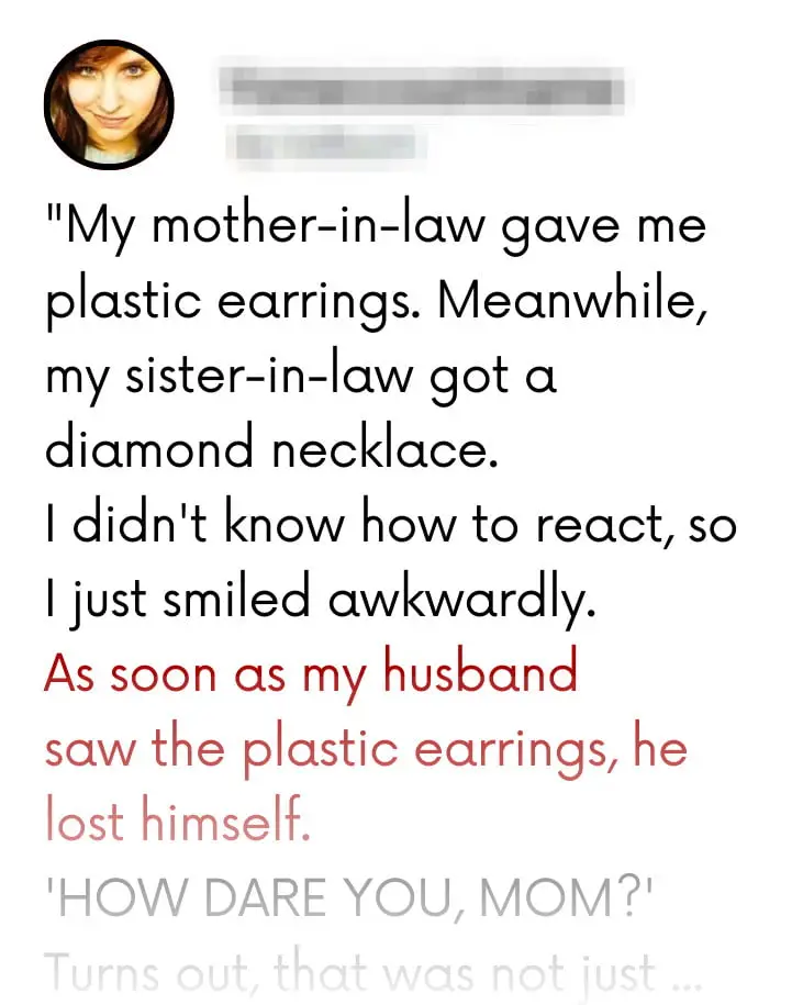 My mother-in-law gave me plastic earrings. Meanwhile, my sister-in-law got a diamond necklace. I didn’t know how to react, so I just smiled awkwardly.