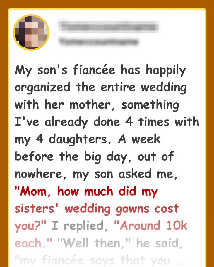 “Well then,” he said, “my fiancée says that now that it’s my turn to get married, you should give me what you gave my sisters for their weddings in order to be a fair parent.” ”What are you saying?” I gasped.