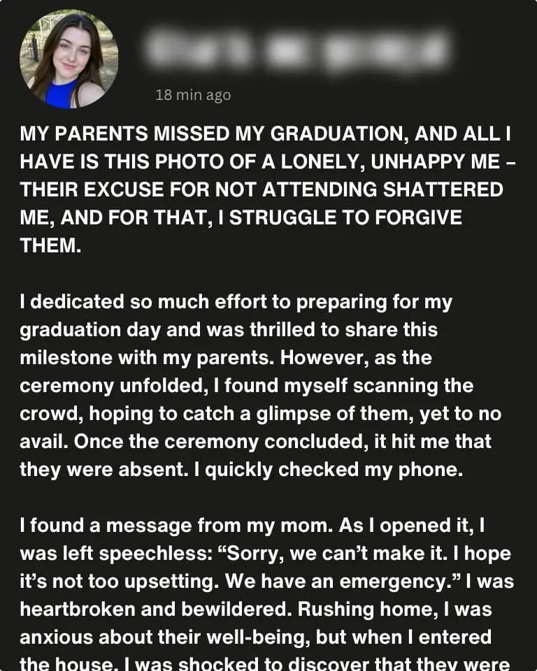 She wondered what could have possibly been more important than her graduation and couldn’t wait to get home and be there for her parents.