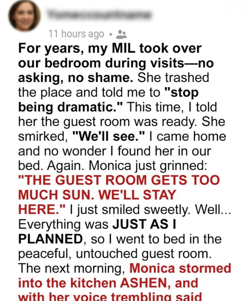 For years, my MIL Monica took over our bedroom during visits-no asking, no shame. She trashed the place and told me to “stop being dramatic.” This time, I told her the guest room was ready.