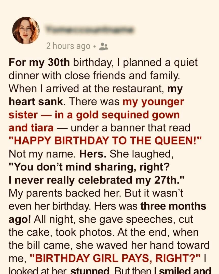 But boy, was I wrong! For my 30th birthday, I decided to plan something simple, low-key, and not extravagant — a cozy dinner at a nautical-themed restaurant overlooking the bay. I wanted just the people who mattered: my close friends, a few cousins, and, begrudgingly, my parents and Kayla.