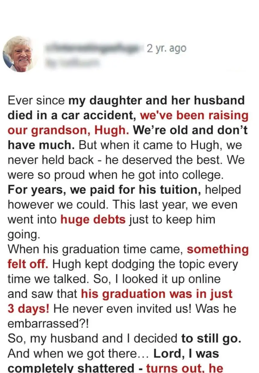 An elderly couple spends their last funds to ensure their grandson has a good education, but when graduation day arrives, he does not invite them.