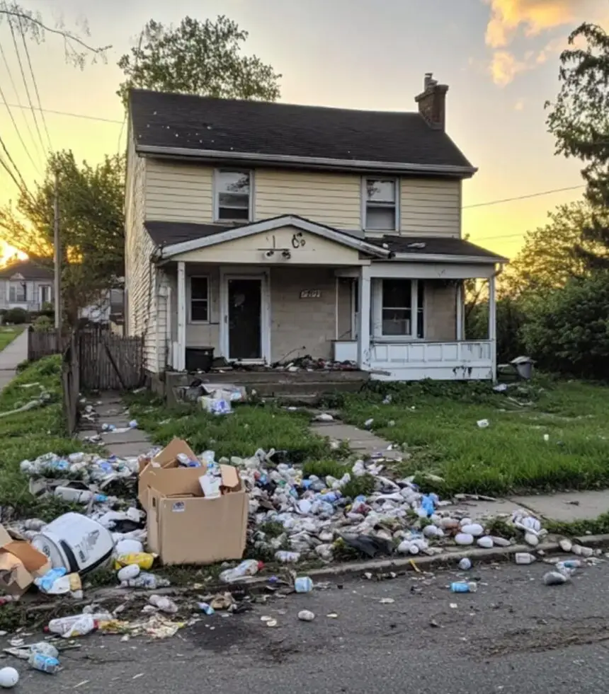 His jaw dropped when he saw the state of his house. Smashed eggs dripped down the walls, their sticky residue glinting in the sunlight.