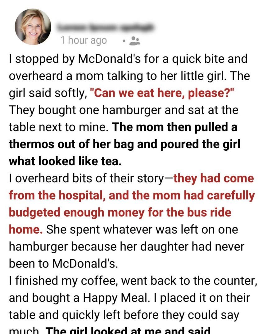 As I ate, I could catch gentle pieces of their conversation. They had just come from a hospital appointment, and the mother had budgeted only enough money for their bus fare home. She had bought the hamburger not because they weren’t hungry, but because her daughter had always wanted to try McDonald’s “just once.” The little girl took slow, delighted bites, savoring each one as if it were something magical.