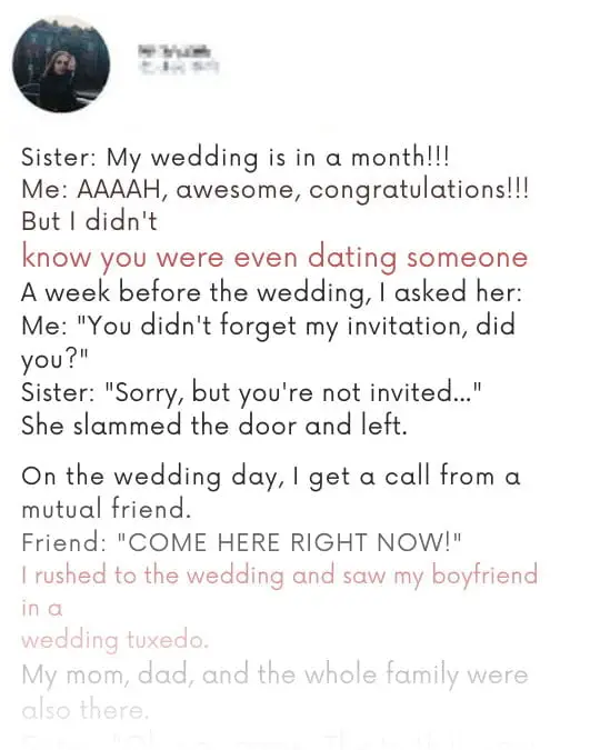 The bride called her with a response similar to “Good, well now you can be back in the wedding.” Needless to say, she did not even attend it.