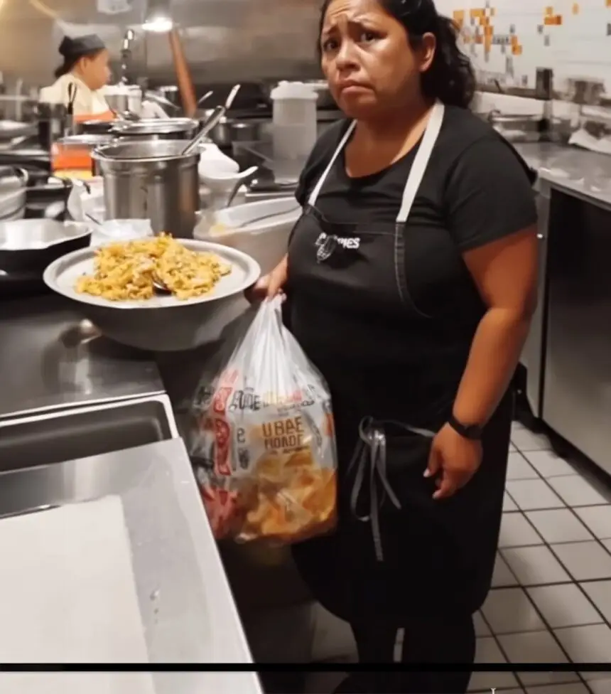 As he was passing, he noticed that one of the women was scraping the leftover steak from one of the dishes on a tray into a plastic bag tied to her waist under her apron. When she finished, she carefully rinsed the dish and placed it in the dishwasher.