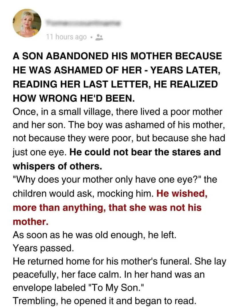 This is the story of a son who abandoned his mother out of shame, only to return years later and find a letter that brought him to his knees in tears.