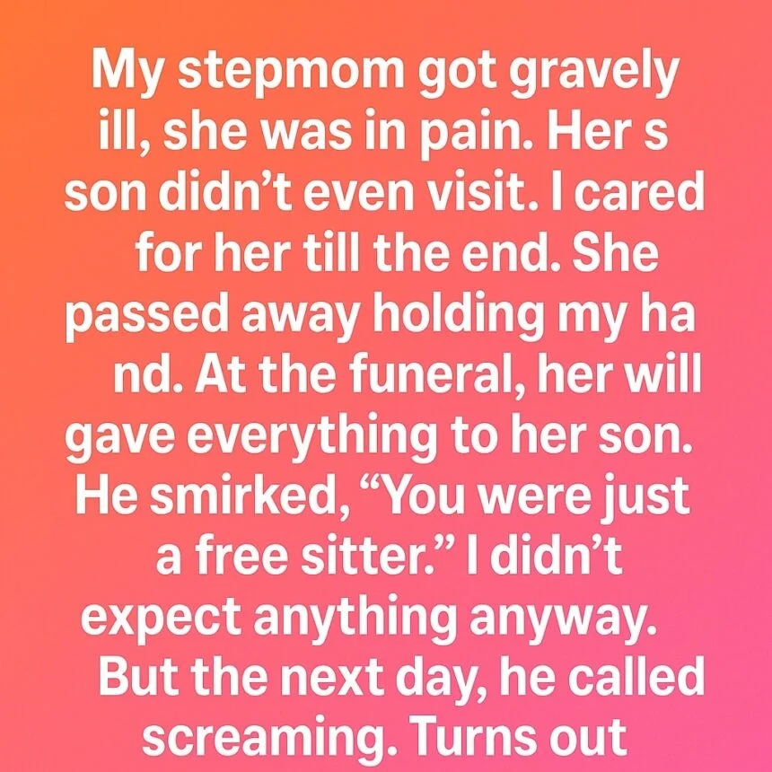 It wasn’t addressed to him—it was addressed to me. In it, she thanked me for caring for her with patience and kindness when she felt most vulnerable. She wrote that while she couldn’t change her will without causing family conflict, she hoped her words would remind me that what I gave her mattered more than anything she could give in return.