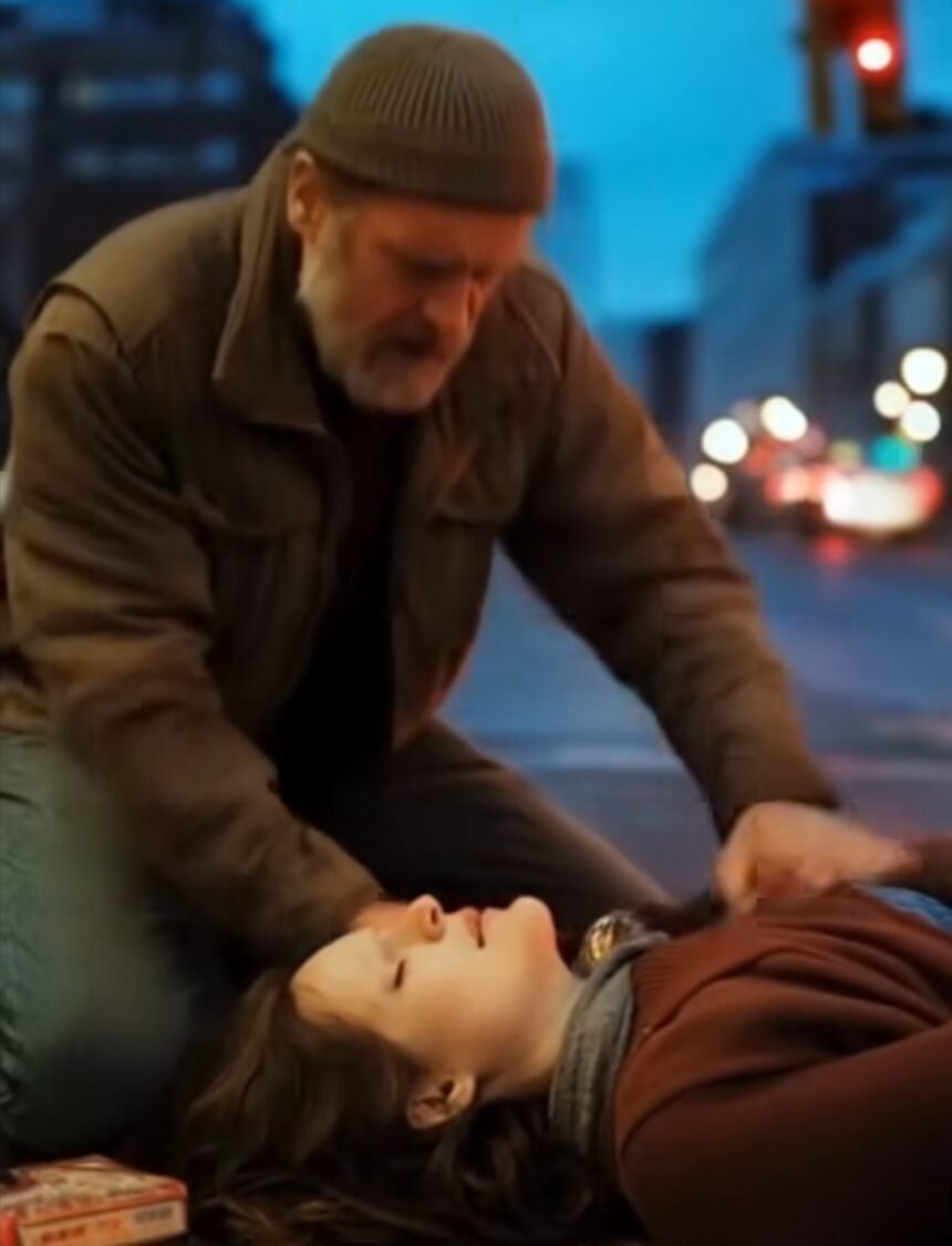 Gently, he placed his worn-out coat beneath her and called for help, his bruised face calm and unwavering in the storm.