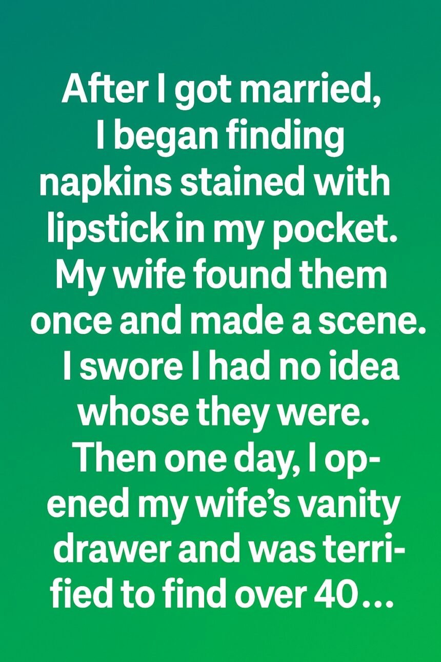 Then one day, I opened my wife’s vanity drawer and was terrified to find over 40… identical lipsticks. For months, the mysterious lipstick stains caused tension between us. Every time I pulled a crumpled napkin out of my work jacket or jeans, I felt a mix of panic and confusion.