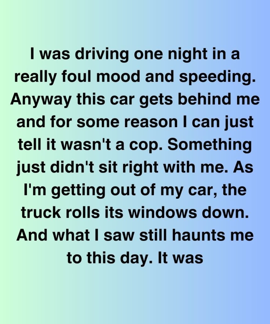 I was driving one night in a really foul mood and speeding. Anyway this car gets behind me and for some reason I can just tell it wasn’t a cop. Something just didn’t sit right with me.