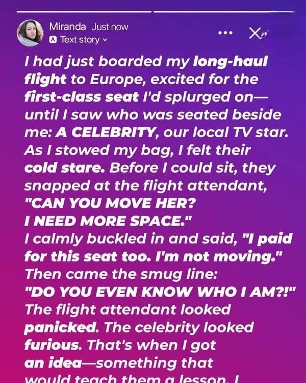 I had just boarded my long-haul flight to Europe, thrilled for the first-class seat I’d saved for. But the excitement faded when I saw who was beside me—our local TV star, famous and intimidating. Before I could sit, they glared at me and snapped at the flight attendant to move me calmly buckled my seatbelt and said, “I paid for this seat too.