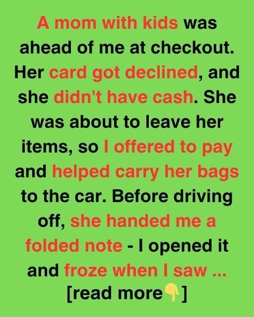 She gave me a folded note before driving away. When I read it, I froze at what was inside. “You saved my kids,” it said.