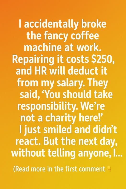 I accidentally broke the fancy coffee machine at work, and HR immediately informed me they would deduct the $250 repair cost from my salary. Their tone was firm, reminding me that responsibility mattered in the workplace. I simply nodded, even though the situation stung a little.