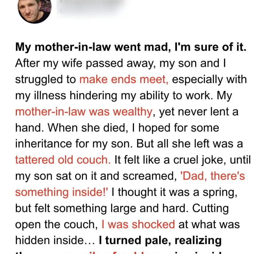 Kevin stared at the slightly shabby and stained sofa Granny left him in her will.